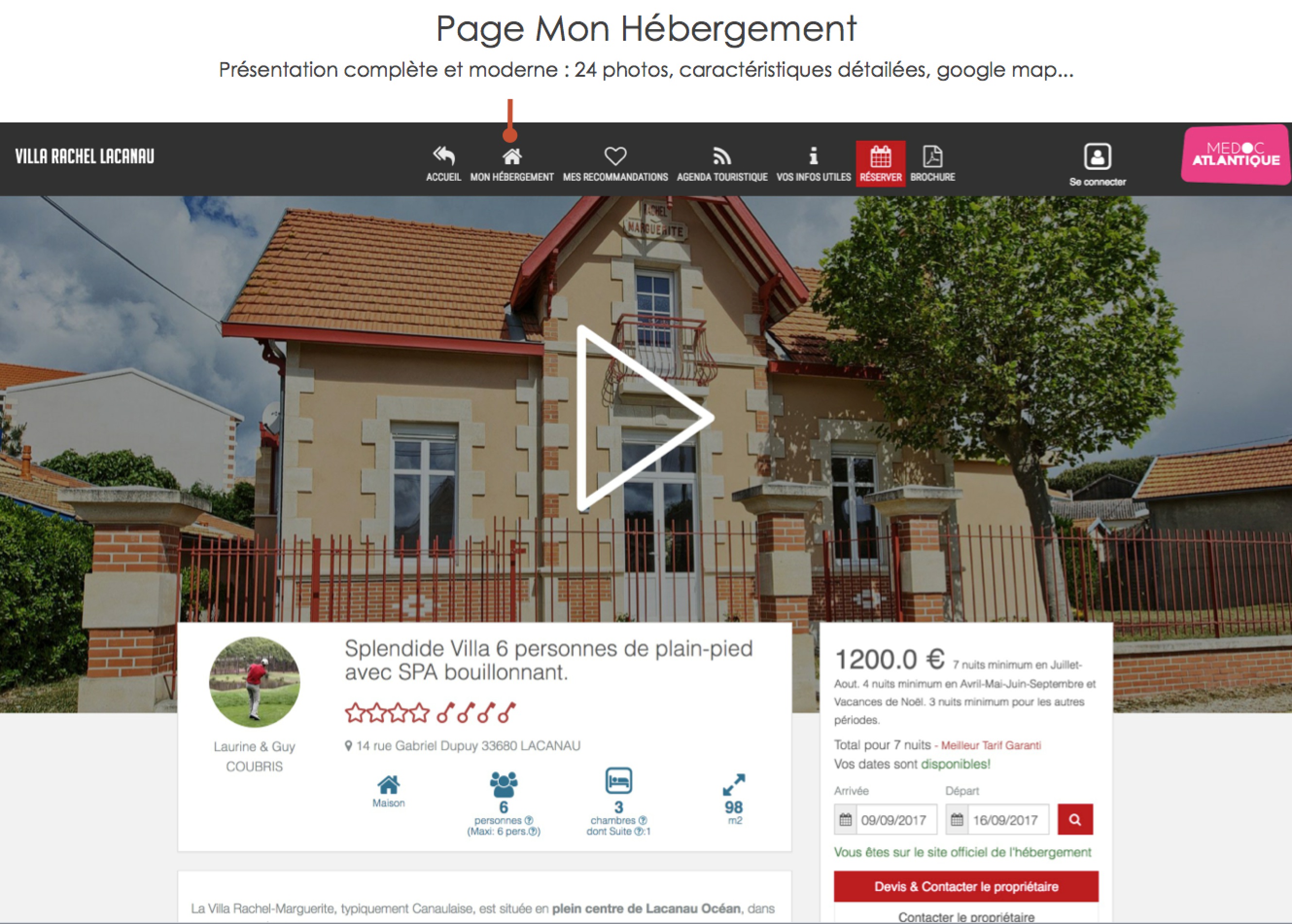 Votre site comporte une page hébergement (une page par logement, si vous en avez plusieurs), avec photos, descriptif, caractéristiques, un planning pour chaque logement ou chambre, un moteur de réservation avec tarifs par nuit, weekend et semaine pour chaque période. La page de vos recommandations touristiques est alimentée par les données touristiques de l'Office de Tourisme, vous sélectionnez les restaurants, activités, parcours nature... autour de votre meublé touristique que vous recommandez pour vos vacanciers. La page agenda touristique indique les évènements de la semaine. La présence du logo de l'Office de Tourisme rassure le vacancier pour réserver en direct. Le site est ergonomique, moderne, responsive et facile d'utilisation, vous pouvez modifier vous même le contenu de votre site sans aucune connaissance informatique et nous sommes disponible pour toute aide. Nous sommes une entreprise française.